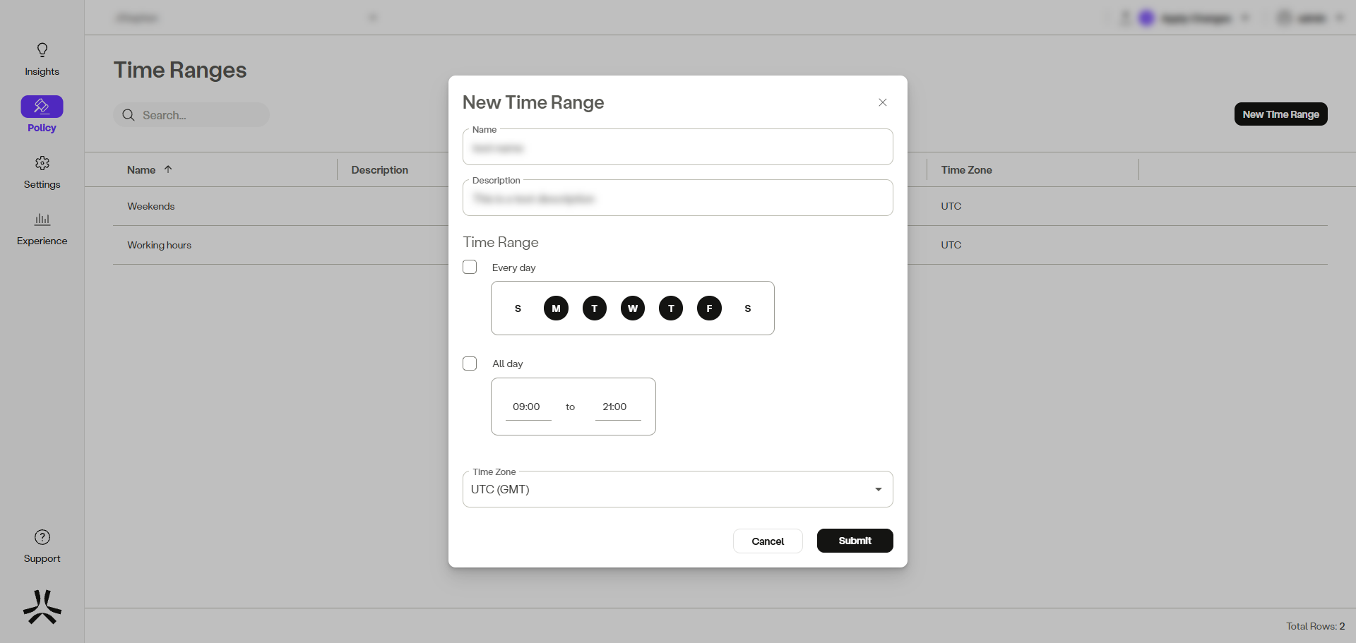 - In the management console, click Policy -> Time Ranges -> Add Time Range.