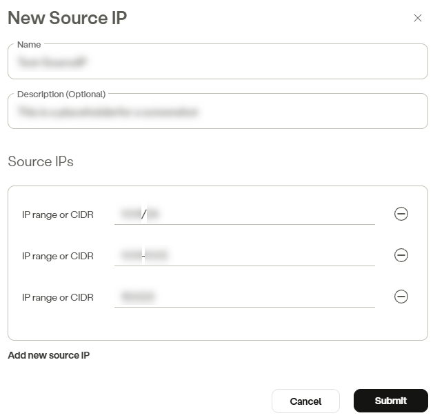 Click Add new source IP to add a new IP range or CIDR.