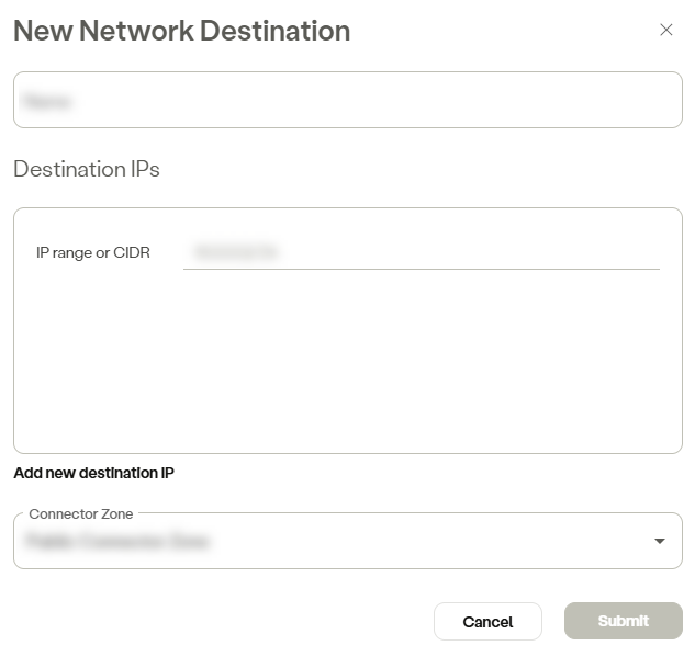 Networking Destinations allows you to route user traffic to any network by defining destination IPs, IP ranges, CIDR, and so on, and associating these parameters with a connector zone that can reach those resources. For more information, see Connector Zones.